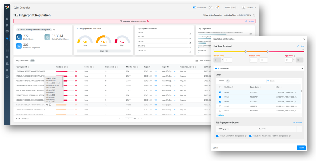 Radware Global Feed Integration – Gain automatic access to a curated list of high-risk TLS fingerprints, which is updated multiple times a day based on Radware’s global threat intelligence.