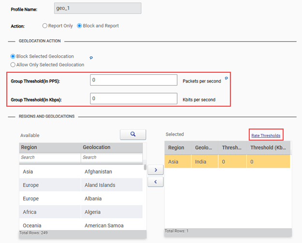 When action is set to Block Selected Geolocation, the Group Threshold applies to 0‑threshold countries listed in the right‑side table (as shown above).