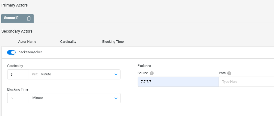 Blocking Mechanism—If an HTTP request contains both primary and secondary actors, and the combination is altered for the secondary actor more than the defined threshold within the specified time frame, the primary actor is automatically blocked for a designated blocking time.