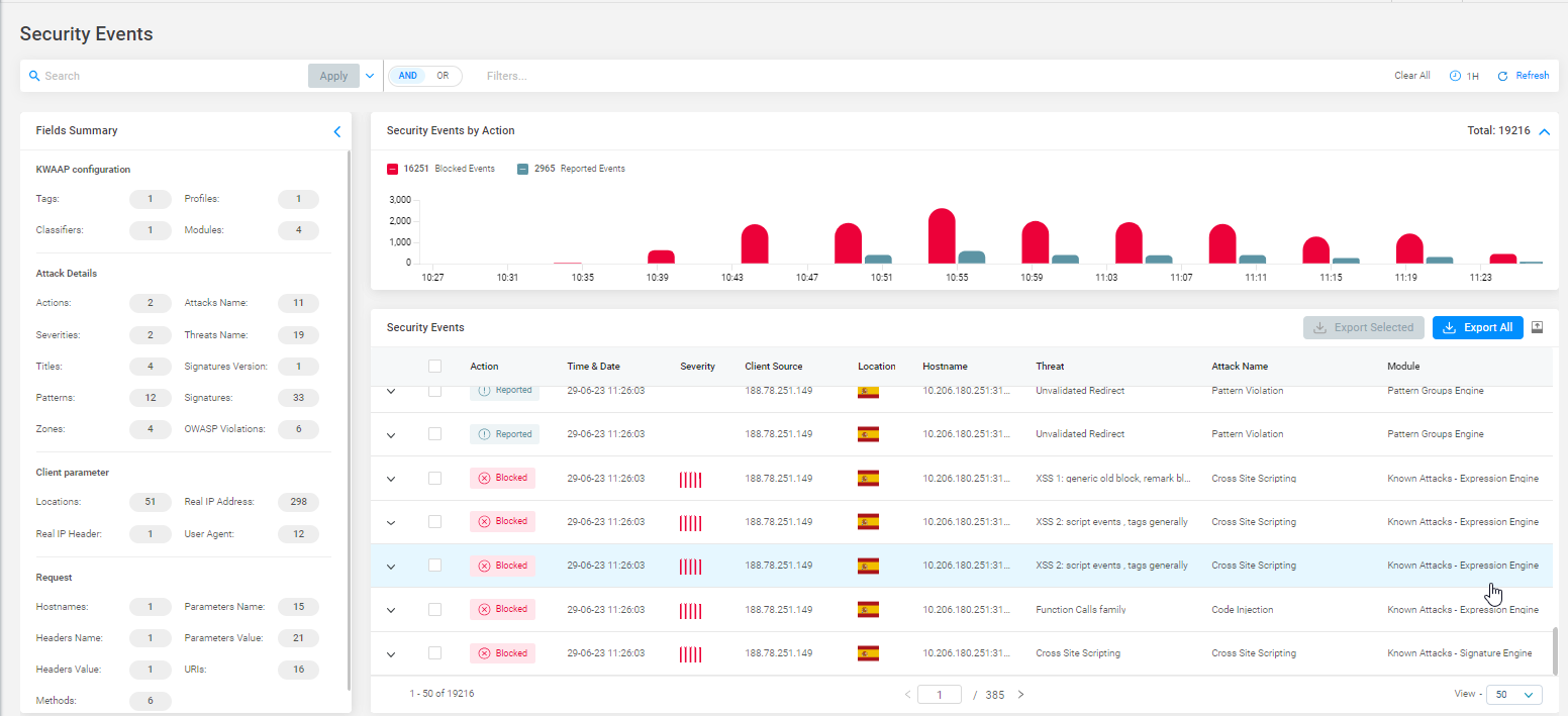 Export Options—To facilitate further analysis or sharing of data, you can export security events in both CSV and JSON formats. You have the flexibility to export all events or select specific ones based on your requirements.