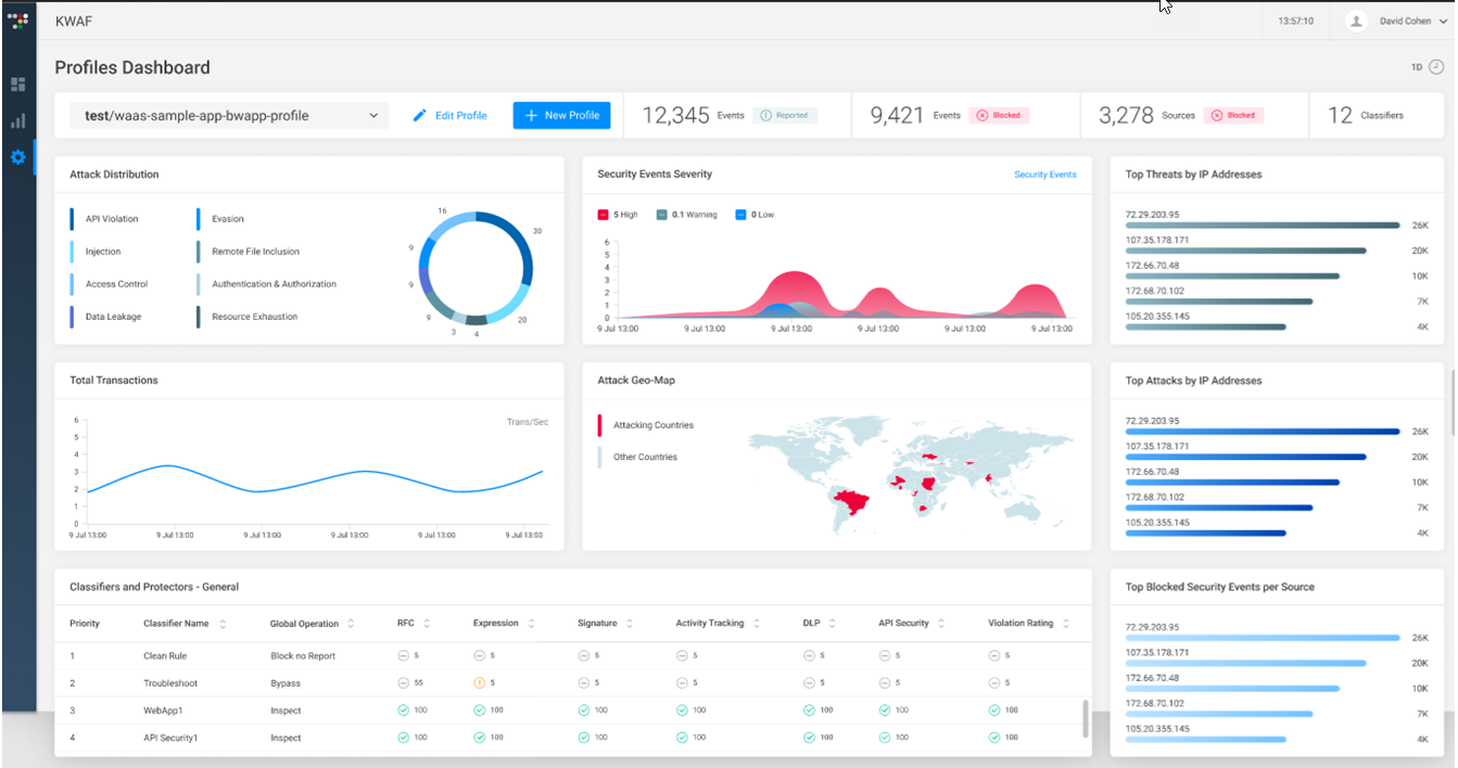 Classifiers and Protectors – General – provides a consolidated view of your profile. It displays a table prioritizing and listing the classifiers and their global operation (block, report, bypass or inspect) and the protections (RFC, Expression, Signature, Activity Tracking, DLP, API Security, and Violation Rating) for each classifier.