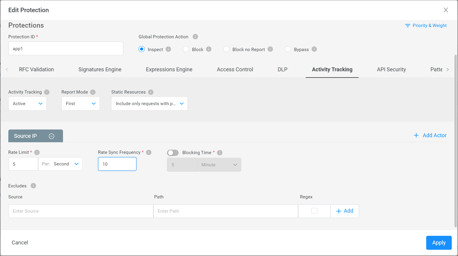 Blocking Time Configuration—Added flexibility to configure Activity Tracking with or without blocking periods. When enabled, the offending source/actor is blocked upon exceeding the defined rate limit per second/minute/hour/day. When disabled, the actor is blocked for the remaining time within the rate limit window.